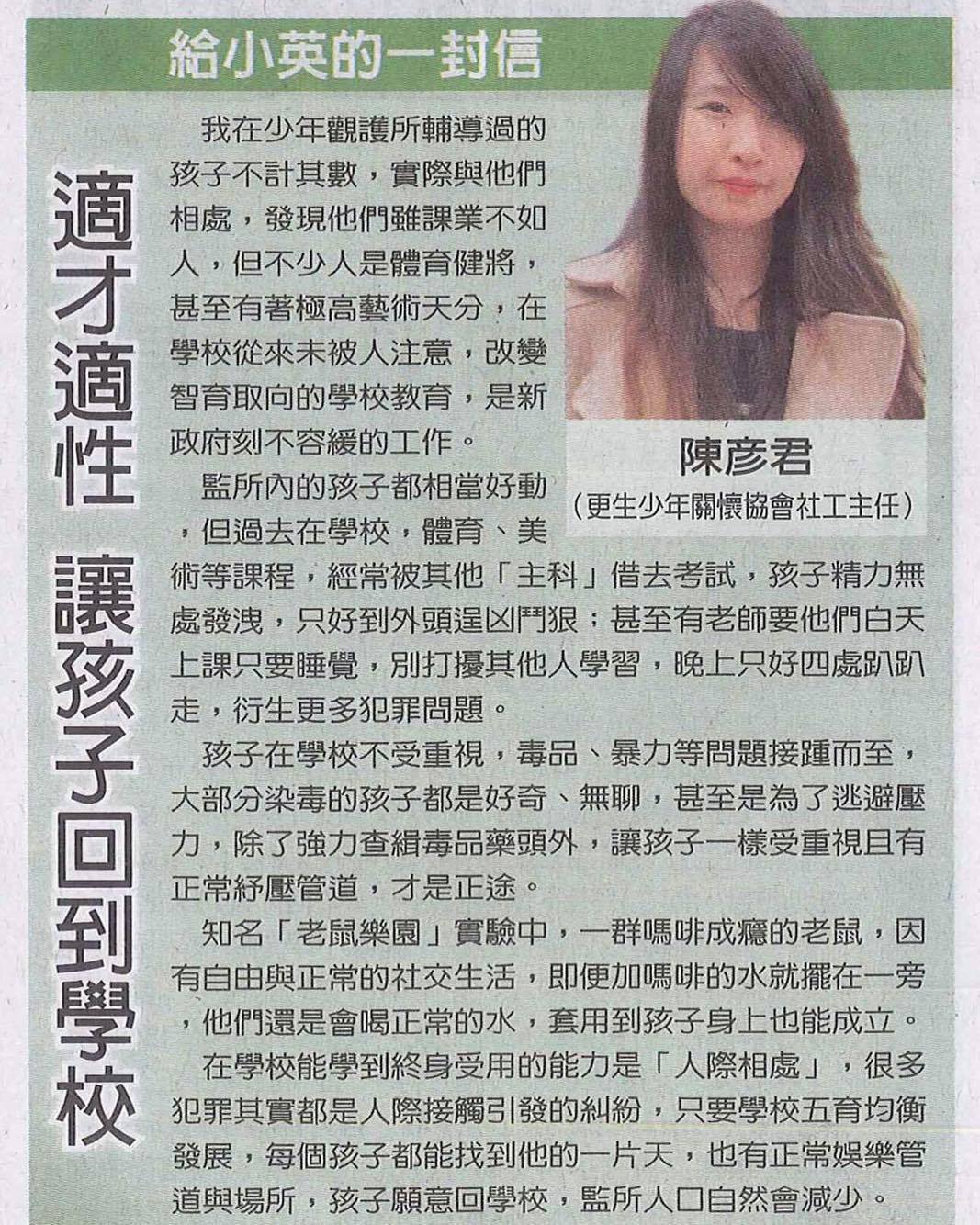 我在少年觀護所輔導過的孩子不計其數,實際與他們相處,發現他們雖課業不如人,但不少人是體育健將,甚至有著極高藝術天分,在學校從來未被人注意,改變智育取向的學校教育,是新政府刻不容緩的工作。