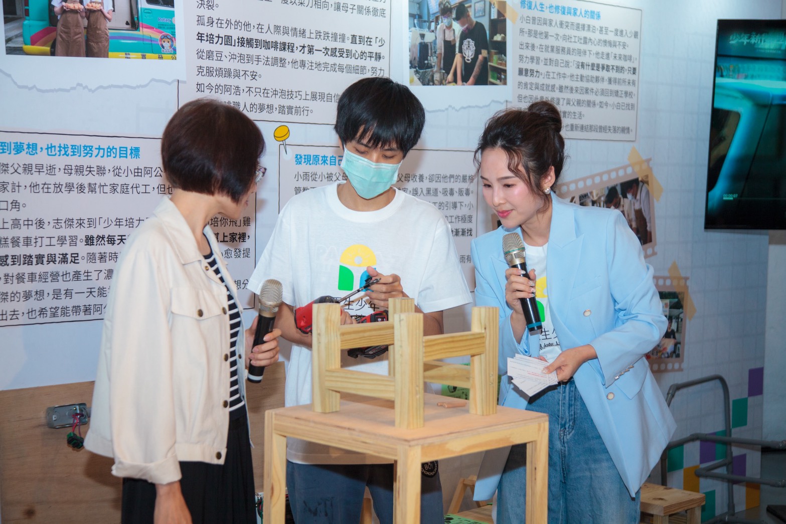 少年偉智以吉他自彈自唱揭開序幕,展現從學習到自信表演的轉變。「培力少女」與公益大使夏于喬一起製作雞蛋糕,以及「木工少年」帶領勞動力發展署黃齡玉署長動手製作木頭小椅凳——這些曾經的學員,如今成為能教導他人的助人者,讓現場貴賓親身體少年的職培成果,並見證他們的成長。