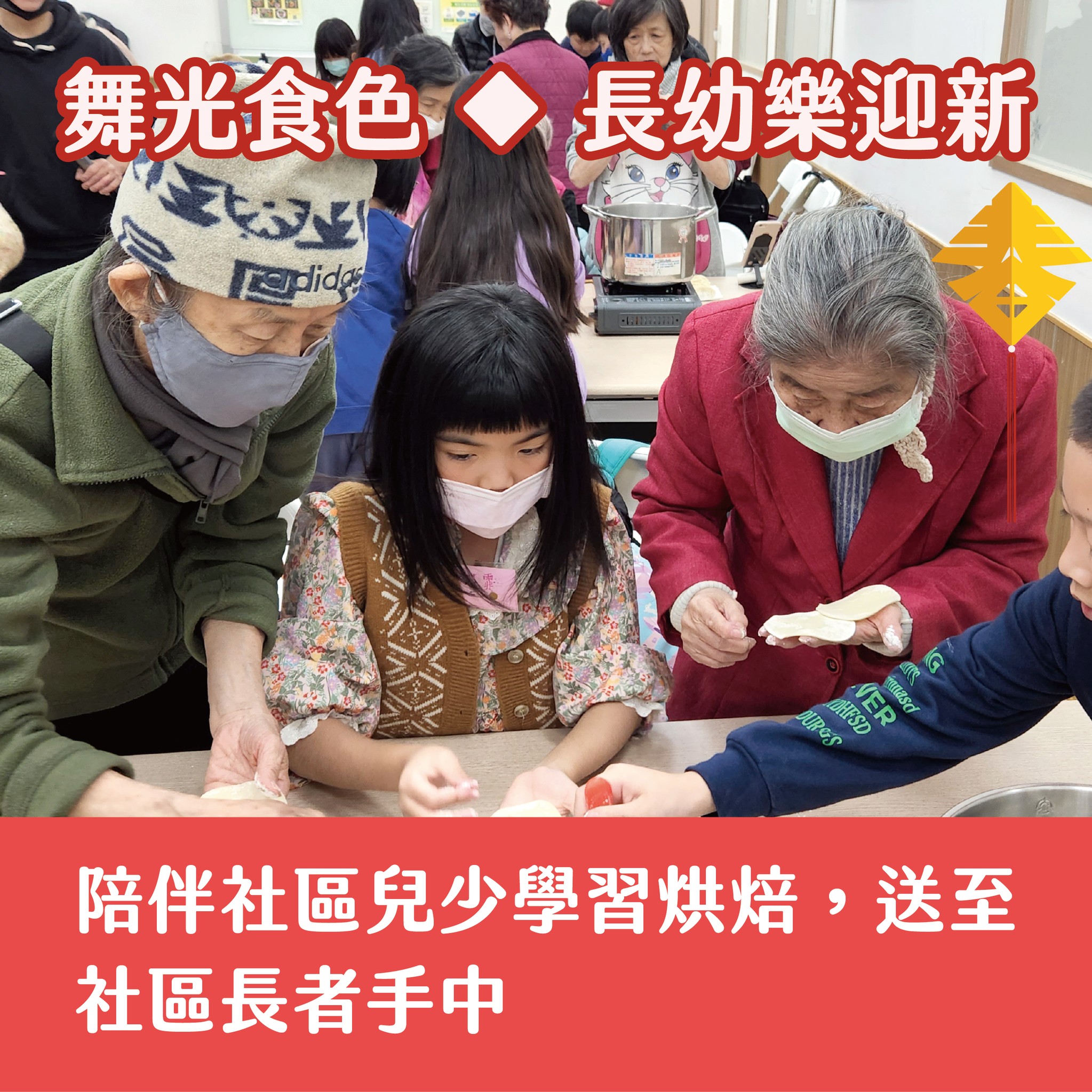 年節時刻,我們將培力 15 位社區兒少學習甜點烘焙,並於社區老人服務中心舉辦「長幼樂迎新」活動,贈送爺爺奶奶們兒少手作甜點。活動結束後,他們將與長輩們攜手烹煮年菜、互動交流,共度溫馨佳節。