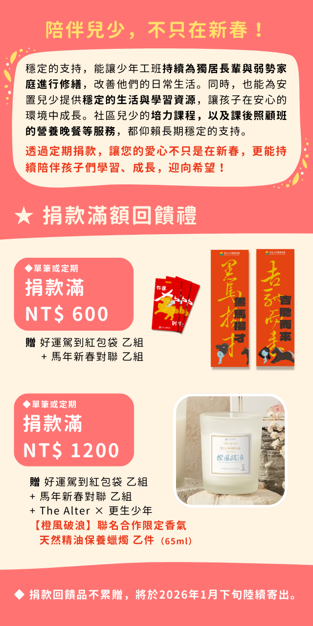 今年,我們邀請你一起加入「新春兒少陪伴計畫」,將捐款化為實際行動,讓溫暖走進需要被接住的生命!